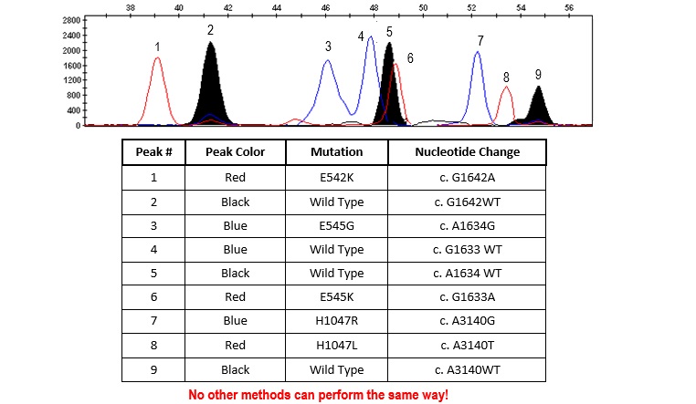The MutectorTM assay can simultaneously detect 5 PIK3CA mutations in the same tube: